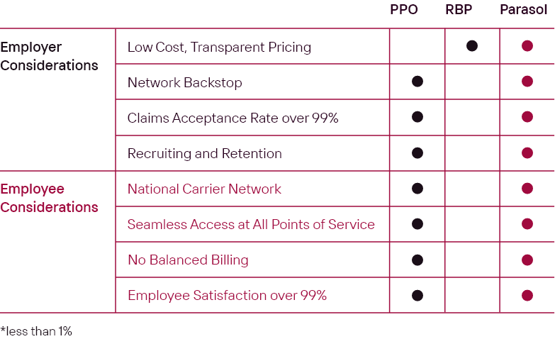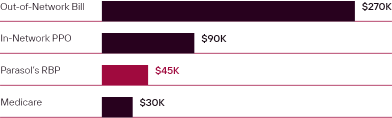 With Parasol, you give employees the benefits of a national network while seeing significant savings for your business compared to other reference-based pricing (RBP) programs or a PPO.
